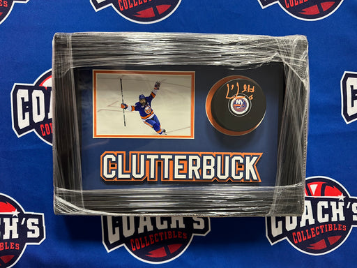This Custom created Shadowbox display contains a Puck Autographed by Former NY Islander Cal Clutterbuck. It measures approximately 13”x8”x4”. This ...