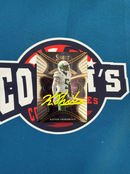 This 2022 Panini Select Draft Picks Rookie card has been personally hand-signed by Defensive Star Kayvon Thibodeaux in YELLOW paint. This item was ...
