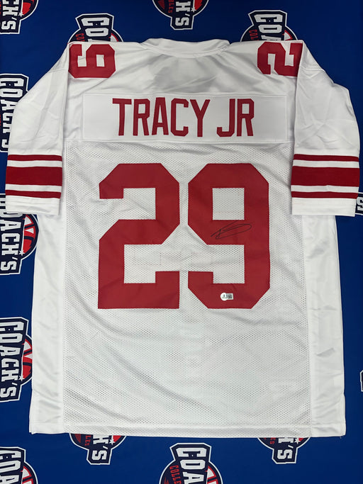 This New York Giants CUSTOM white road jersey has been personally hand-signed by Giants starting Running back Tyrone Tracy Jr. Custom jerseys do no...
