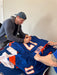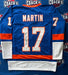 This CUSTOM Blue NY Islanders Jersey has been personally hand-signed by Matt Martin. Custom jerseys are approximately size XL and have no branding or team logos of any sort on them. This item was signed in the presence of and witnessed by a representative of James Spence Authentication. It comes with an individually numbered, tamper evident sticker from JSA which can be reviewed online to ensure authenticity. This process helps to ensure that the product purchased is authentic and eliminates any possibility of duplication or fraud.