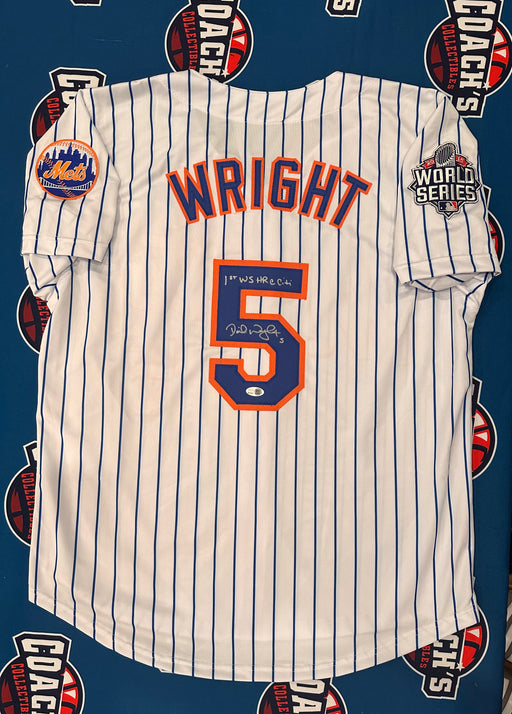 This NY Mets Pinstripe CUSTOM Jersey has been personally hand-signed by Mets Legend David Wright. David has added the inscription "1st WS HR @ Citi...
