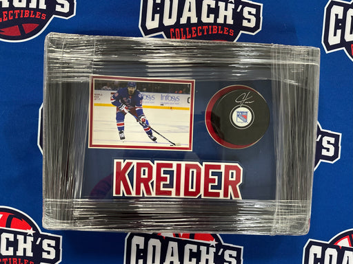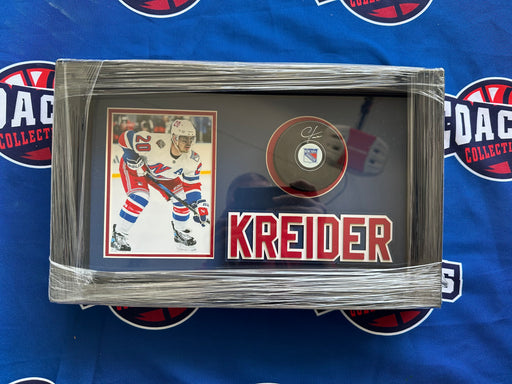 This Custom created Shadowbox display contains a Puck Autographed by NY Rangers Star Chris Kreider. It measures approximately 13”x8”x4”. This shado...