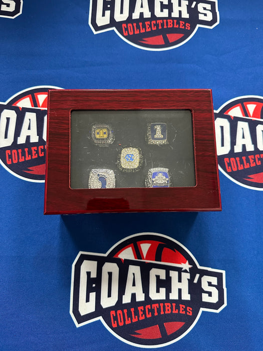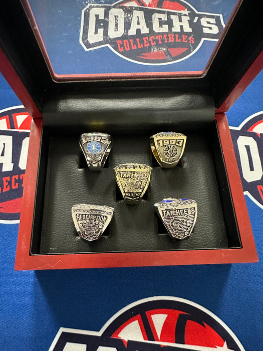 Amazing Collectors item of 5 North Carolina Men’s Basketball National Championship Replica Rings with incredible display box that holds all rings! Amazing quality rings made of heavy duty alloy, not the cheap plastic replicas! Approximately Size 11.